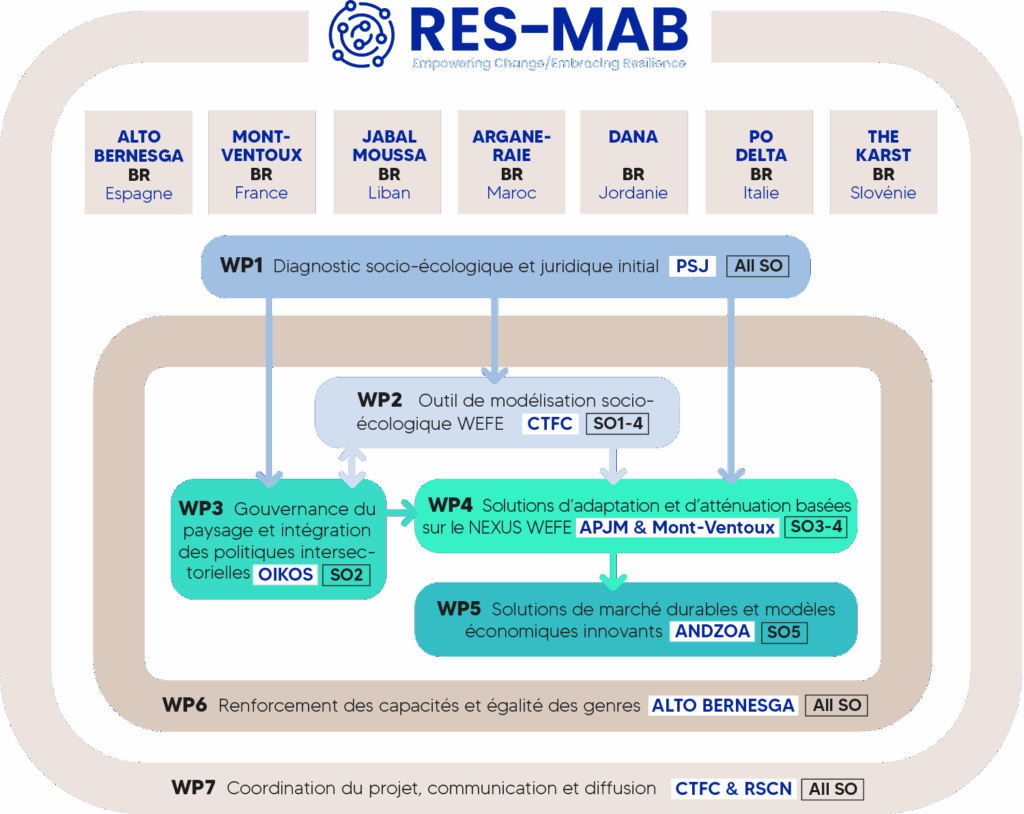 - Promouvoir une approche de gestion du paysage intégrative (multi-fonctionnelle, multi-échelle, multi-acteurs et intersectorielle) en développant et en mettant en œuvre un outil de modélisation socio-écologique basé sur le Nexus Eau-Énergie-Alimentation-Écosystèmes (ci-après appelé outil WEFE-SEM) afin de renforcer la résilience et l’adaptation au changement climatique dans sept Réserves de biosphère méditerranéennes de l’UNESCO.